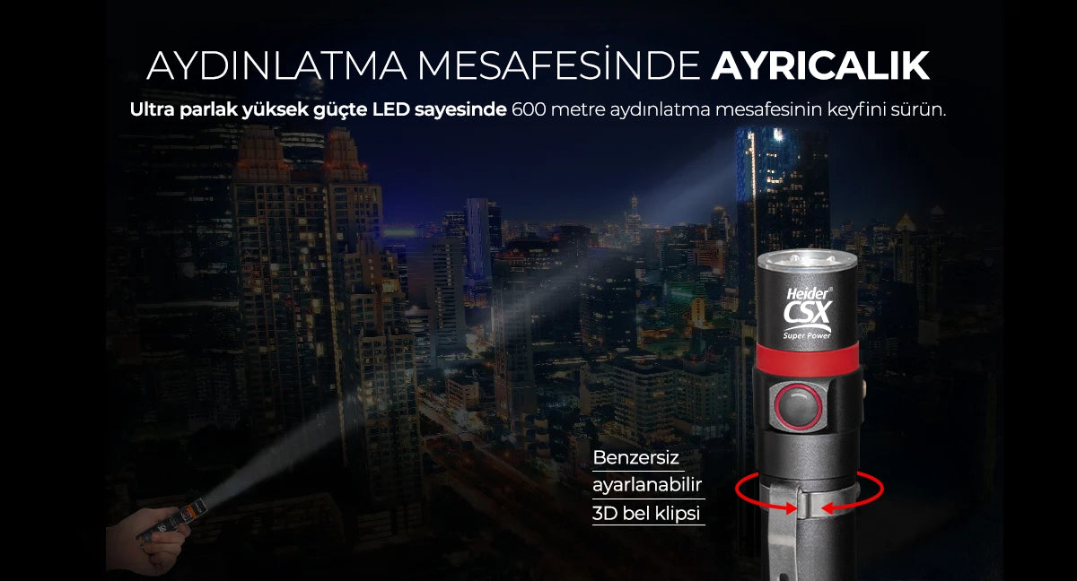 Heider CSX Super Power V4, yüksek performanslı HDD 5+3 Mikro RSL sürücü devresi ile daha fazla güce sahiptir. İnanılmaz zoom özelliği ile bu aydınlatma modları tüm aktivitelerinizde daha etkili bir performans sergiler. Heider CSX Super Power V4, ultra düşük modda 220 saate kadar aydınlatma sağlar.