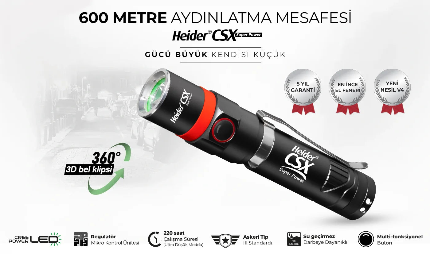 Heider CSX Super Power V4, Fenerinizi XR-18650 tipi, 3.7V şarj edilebilir batarya ile kullanılmaktadır.