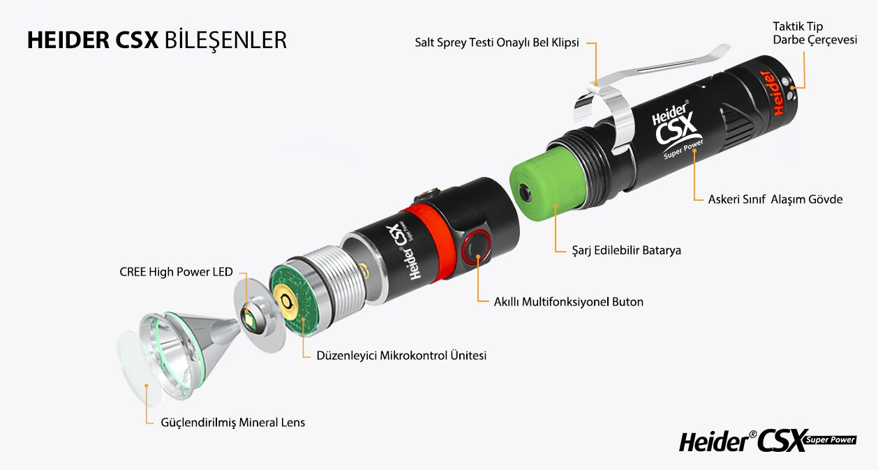 Heider CSX Super Power tüm dış faktörlere karşı dayanıklı olacak şekilde tasarlanmıştır. CSX’in darbelere ve suya dayanıklı askeri tip anodize aluminyum kasası iç aksamı korur.