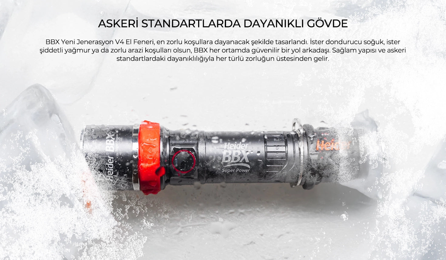 Heider BBX Super Power V4, sizin kullanım alanlarınız göz önünde bulundurularak paslanmaz malzemeler kullanılarak üretilmiştir. Böylece nemli ortamlardan etkilenmez. Çoğu el fenerinde bulunmayan tutturma halkası sayesinde istediğiniz yere takabilirsiniz.
