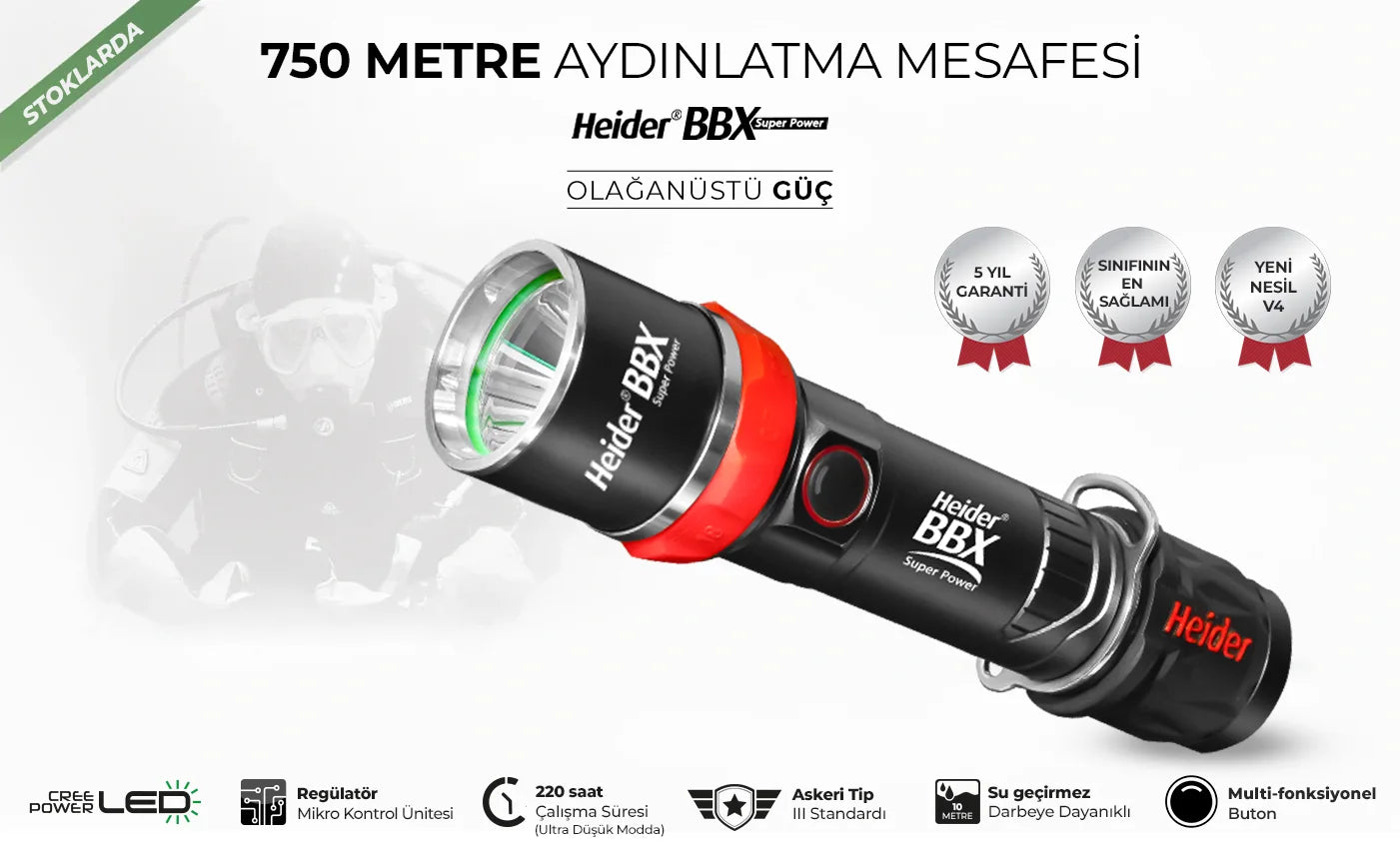 Heider BBX Super Power V4, özel tasarım AR lensi ile birlikte CREE Power LED teknolojisi ile donatılmıştır. BBX Super Power V4, ultra düşük modda tek şarj ile 220 saat aydınlatma sağlar. Heider BBX Super Power V4'ün gücü tesadüf değildir, gücünü en üst düzey tasarım anlayışından alır.