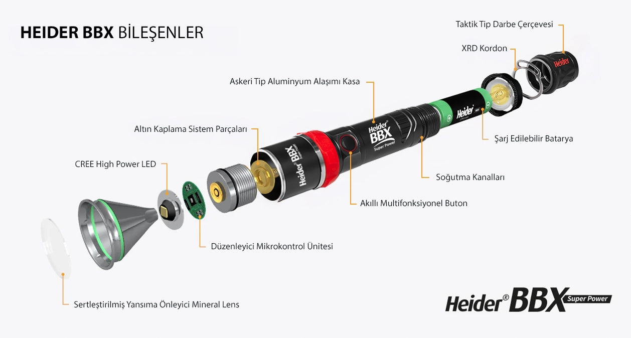 Heider BBX Super Power V4, Fenerinizi XR-18650 tipi, 3.7V şarj edilebilir batarya ile kullanılmaktadır.