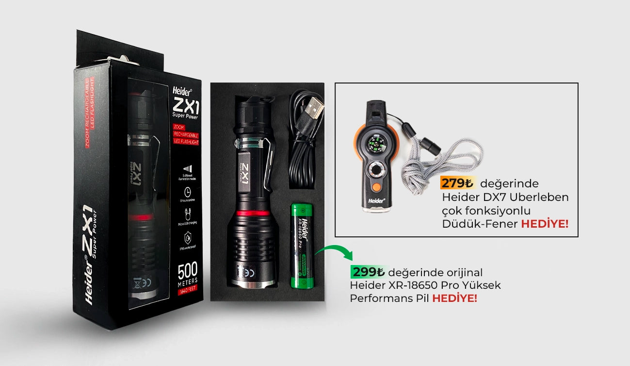 • Hediyeler: 279 TL değerinde Heider DX7 Uberleben çok fonksiyonlu Düdük-Fener + 299 TL değerinde Heider XR1850 Pro Şarjlı Pil (Toplam 2 Pil)
