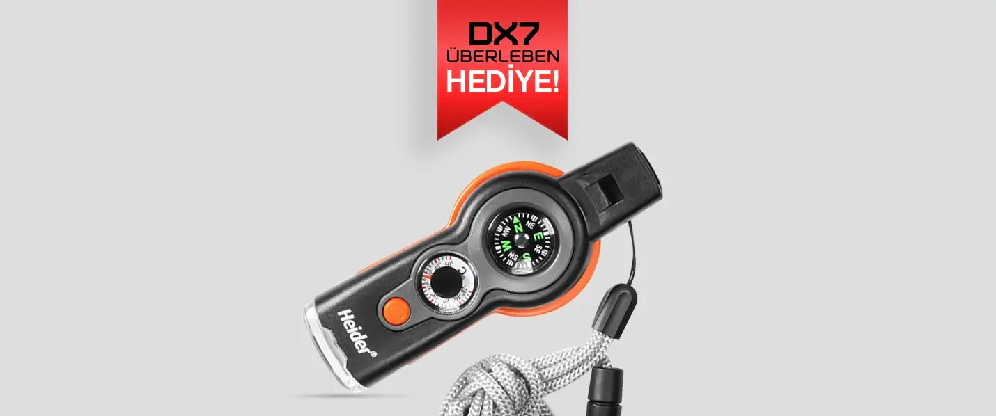Hem acil durumlar hem de outdoor aktiviteleri için tasarlanan çok fonksiyonlu Heider DX7 Überleben, 7 farklı özellikle donatıldı: Yüksek Sesli Düdük, LED Fener, Pusula, Termometre, Ayna, Büyüteç, Bağlama Kordonu.