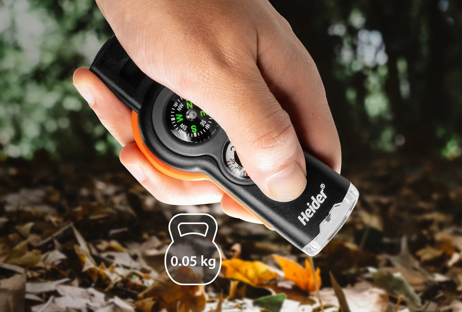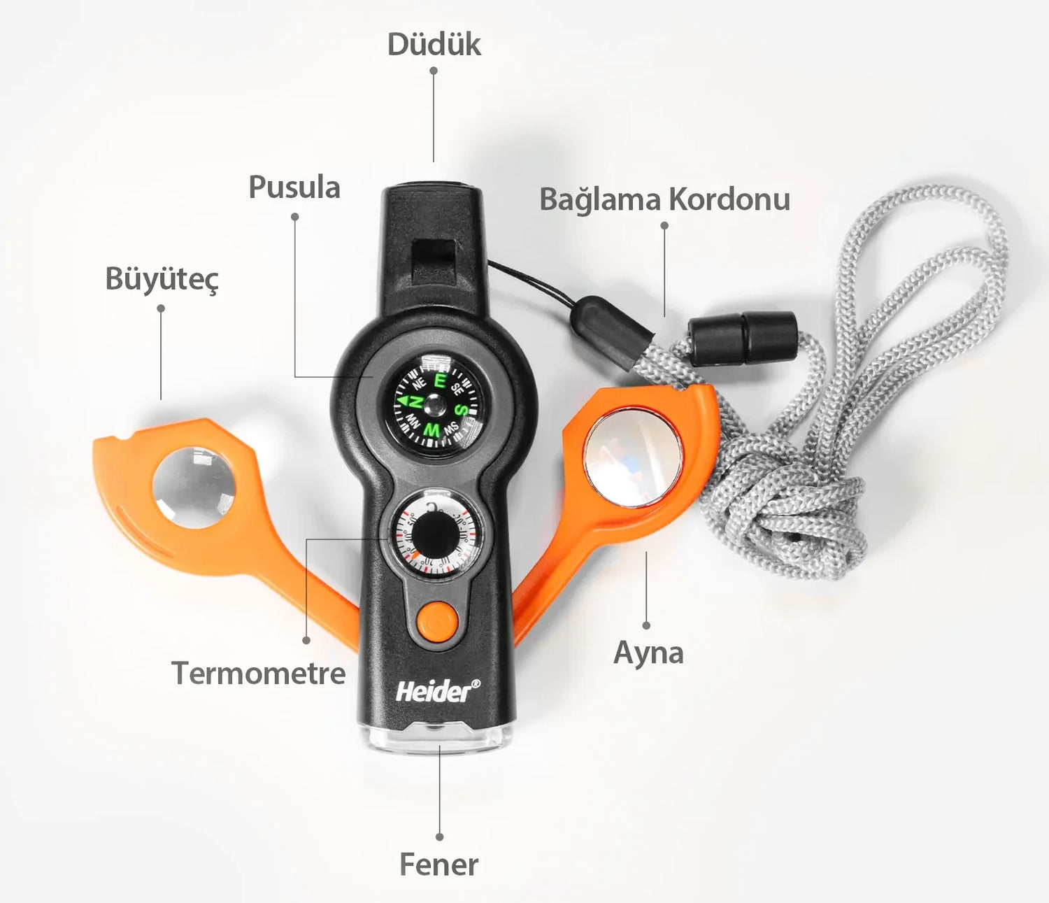 Heider DX7, acil durumlarda kullanabileceğiniz çok yönlü bir üründür. Yüksek sesli düdük, fener, büyüteç, pusula, termometre ve ayna özellikleri ile donatılmıştır, bu da onu doğa yürüyüşleri, kamp ve açık hava maceraları için ideal kılar.