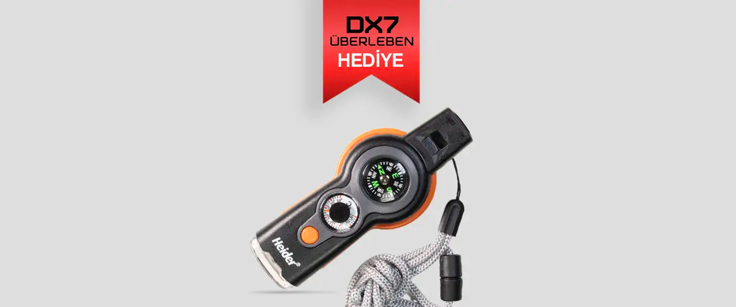 Hem acil durumlar hem de outdoor aktiviteleri için tasarlanan çok fonksiyonlu Heider DX7 Überleben, 7 farklı özellikle donatıldı: Yüksek Sesli Düdük, LED Fener, Pusula, Termometre, Ayna, Büyüteç, Bağlama Kordonu.