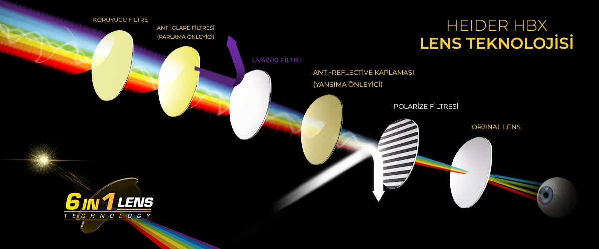 Heider HBX lensleri 6 farklı filtre ile kaplanmıştır. Orijinal lensin üzerine Polarize Filtresi, Yansıma Önleyeci Filtre, UV-400 Filtresi, Parlama Önleyici Filtre ve Koruyucu Filtre kullanılmıştır.