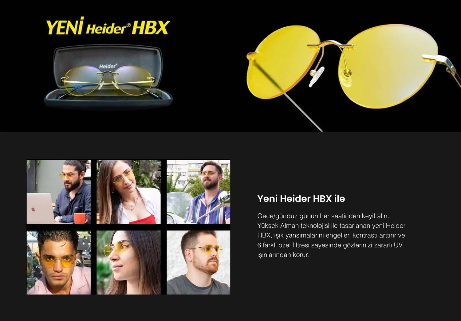 Heider HBX’i Heider HB1 ve Heider HB2’den ayıran fark şıklık ve sadeliğin ön planda olduğu özel tasarımıdır. Günlük hayatta tarzınızın dikkat çekici bir parçası olacak Heider HBX’te kullanılan lensler diğer modellerimiz ile özellik olarak aynıdır. Kısacası Heider HBX, yalnızca sizin gözleriniz için değil, dışarıdan bakacak olan gözler için de tasarlanmıştır.